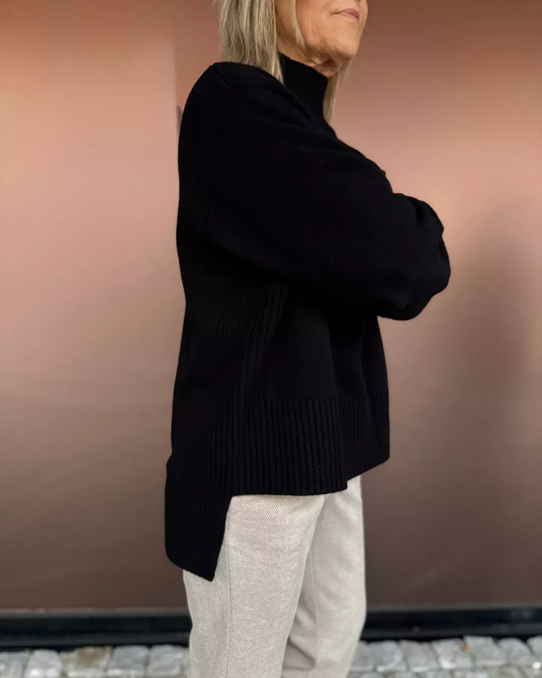 Alfie Sweater fra Close To My Heart, chunky strikket i delikat 100% superfine merino ull. Lang erm, semihøy crewneck, fallende skulder og med fine ribb detaljer. En litt tyngre genser som føles eksklusiv.