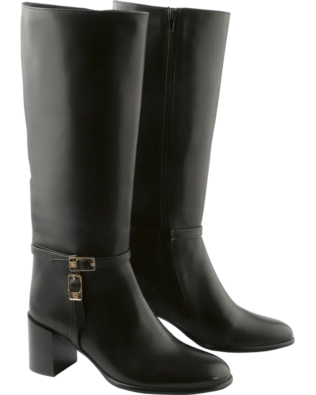 Moderne boots med en ren og stilren silhuett. Laget av mykt, glatt kalveskinn med gyldne spenner ved ankelhøyde som gir et elegant preg. Den spisse tåen og blokkhælen på 70 mm fullender det sofistikerte uttrykket. Komforten er førsteklasses, med mikrofiberfôr, lett TPU-såle og fast integrert innersåle i skinn.