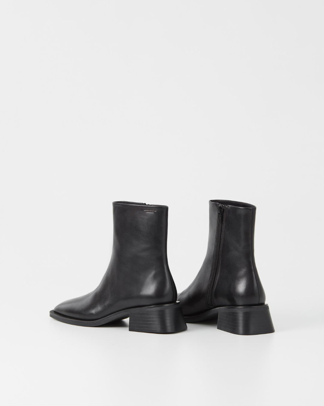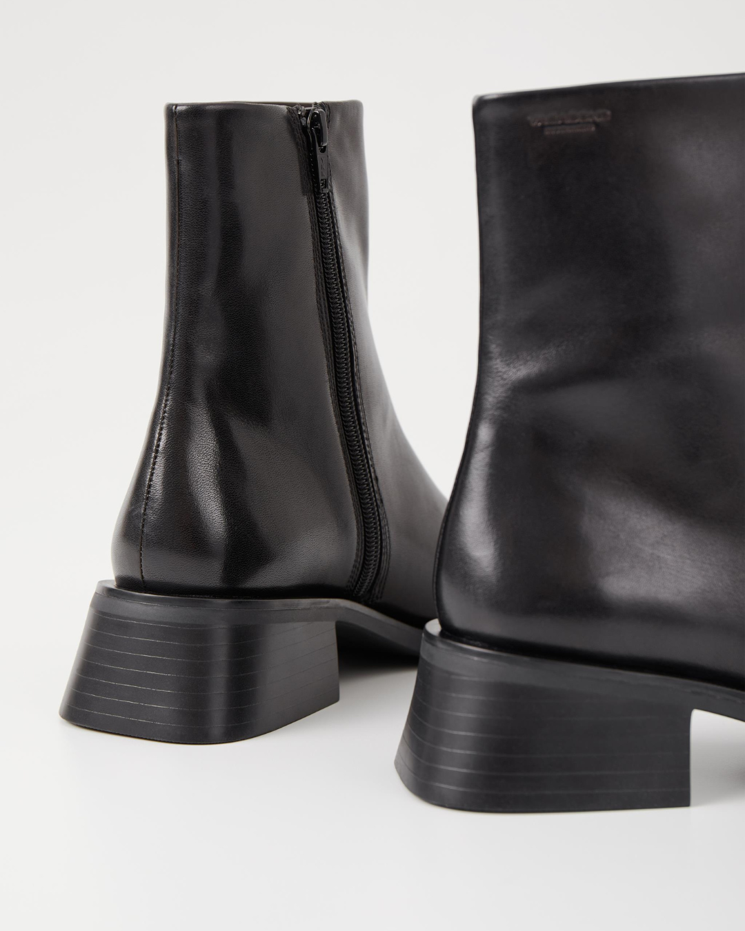 Blanca er stilige ankelstøvletter med et minimalistisk design. Modellen er laget i mørkebrunt skinn med et ankelhøyt skaft og firkantet tå. Den tynne yttersålen har en 47mm utsvingt hæl. Videre detaljer inkluderer glidelås og dekorativ søm foran.