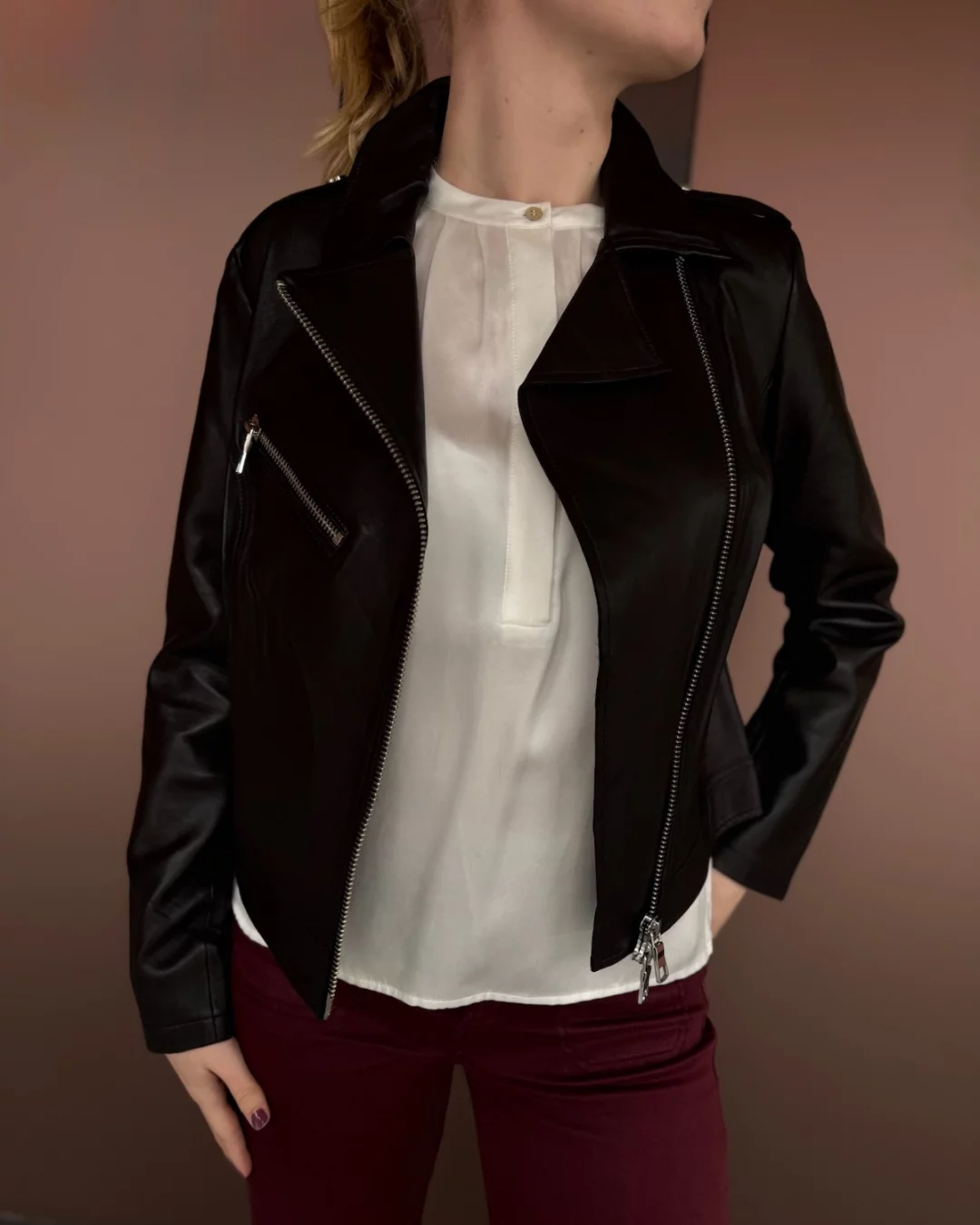 En bikerjakke i mykt lammeskinn med toveis glidelås, plassert på venstre side for et asymmetrisk og moderne uttrykk. Jakken har tre glidelåslommer og dekorative knappestropper på skuldrene som gir et rått og stilfullt preg.