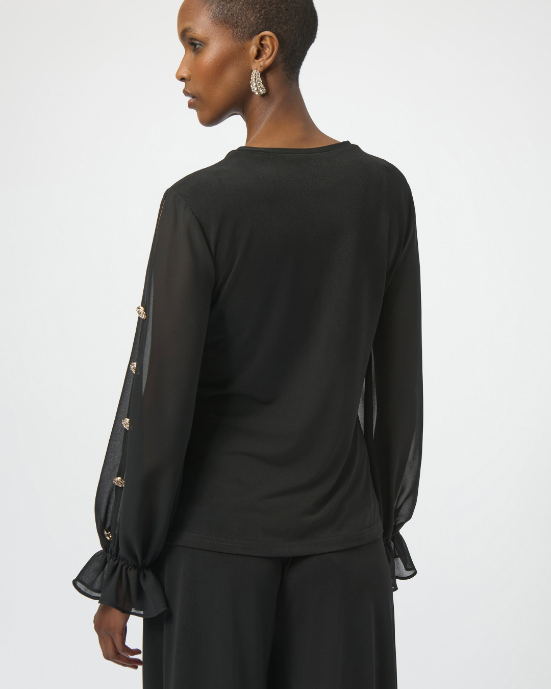 Chic V-neck Pullover fra Joseph Ribkoff er en elegant topp med figurnær passform og en flatterende V-utringning som gir et sofistikert uttrykk. De voluminøse rysjeermene i chiffon tilfører et luksuriøst og romantisk preg, mens gullknapper med rhinestones og diskrete slisser ved mansjettene gir en utsøkt finish. Et perfekt valg for deg som ønsker en feminin og moderne stil med gjennomførte detaljer.