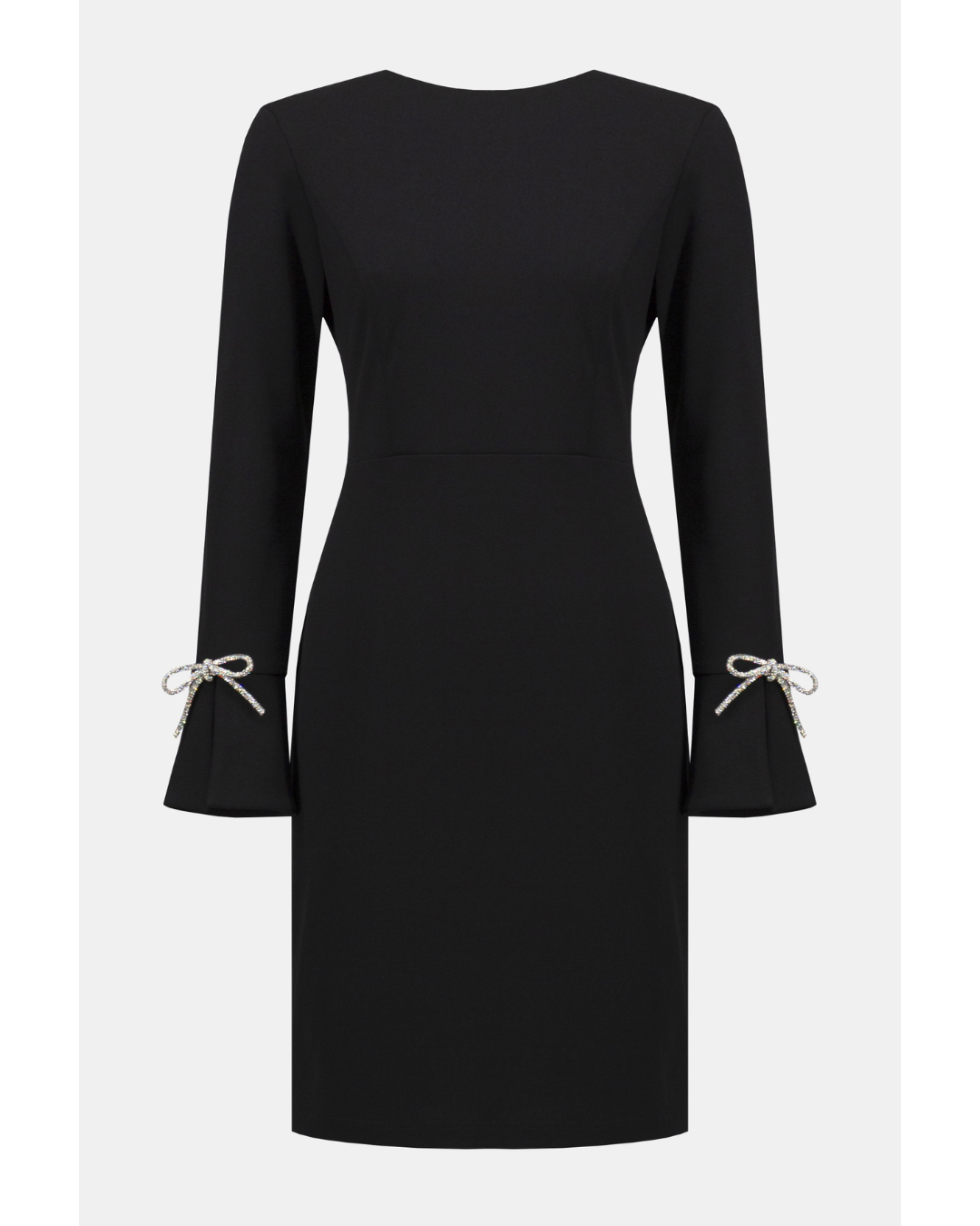 Embellished Bodycon Dress fra Joseph Ribkoff er en elegant kjole med en flatterende shift-silhuett som smyger seg lett rundt figuren. Den har en sofistikert scoop-hals og lange ermer med volangdetaljer og mansjetter, pyntet med små sløyfer i rhinestones som tilfører et subtilt, glitrende preg. Kjolen er laget i scuba crepe som gir struktur og komfort, og passer perfekt til både festlige anledninger og stilfulle kvelder.