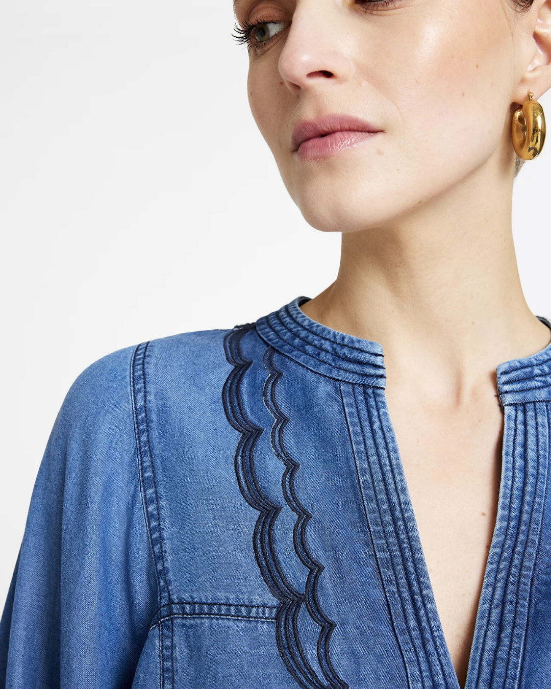 Kaisa, shirt – Washed Blue fra Gustav er en vakker skjorte med et mykt, vasket denim-utseende. Den har V-hals med bølget kant langs knappestolpen, som gir et feminint og dekorativt preg. Små knapper i front og lange ermer med rynkede mansjetter og teksturdetaljer tilfører ekstra finesse.