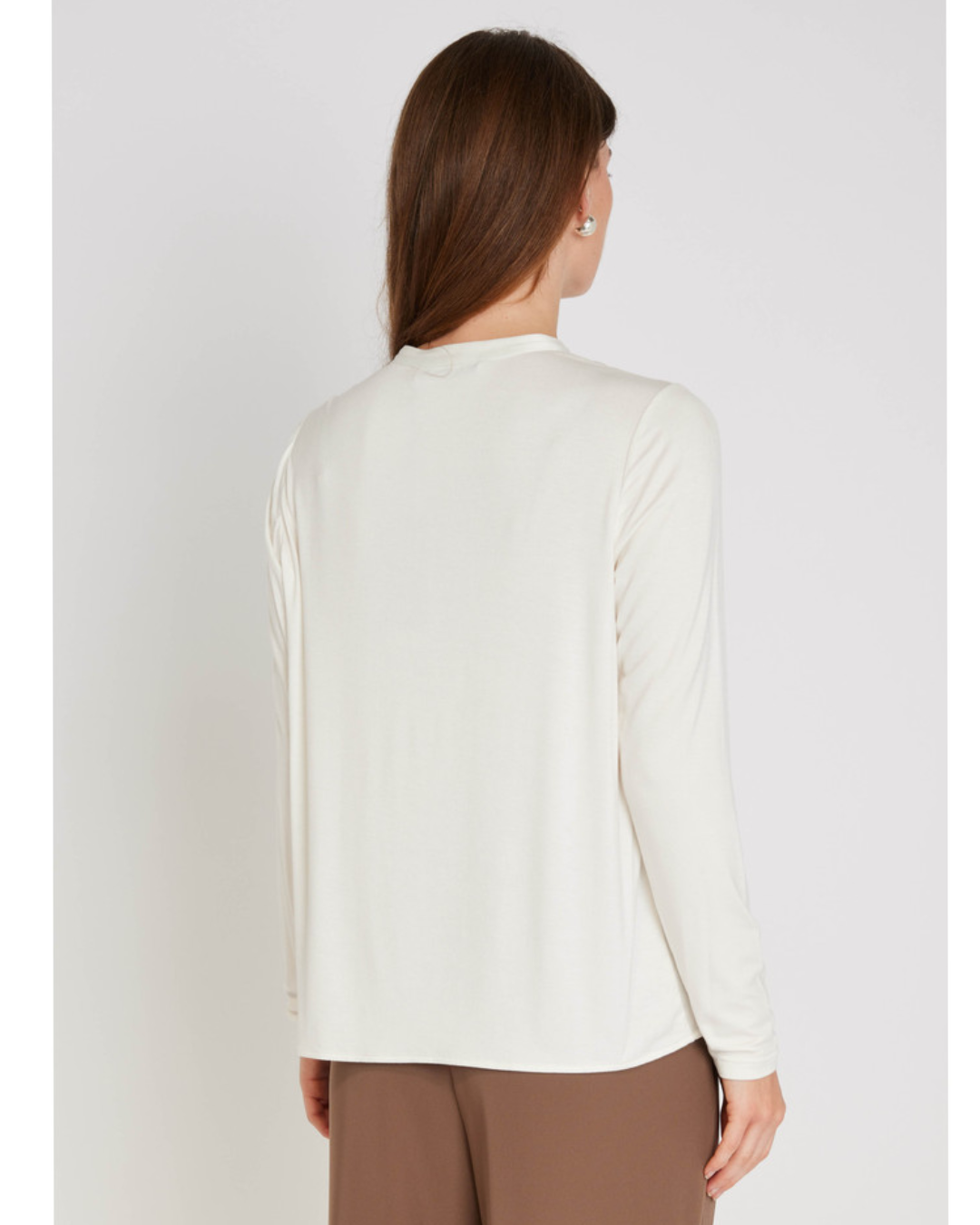 Blusen har et elegant fall over kroppen og legg ved halsen som tilfører volum uten å virke tung.