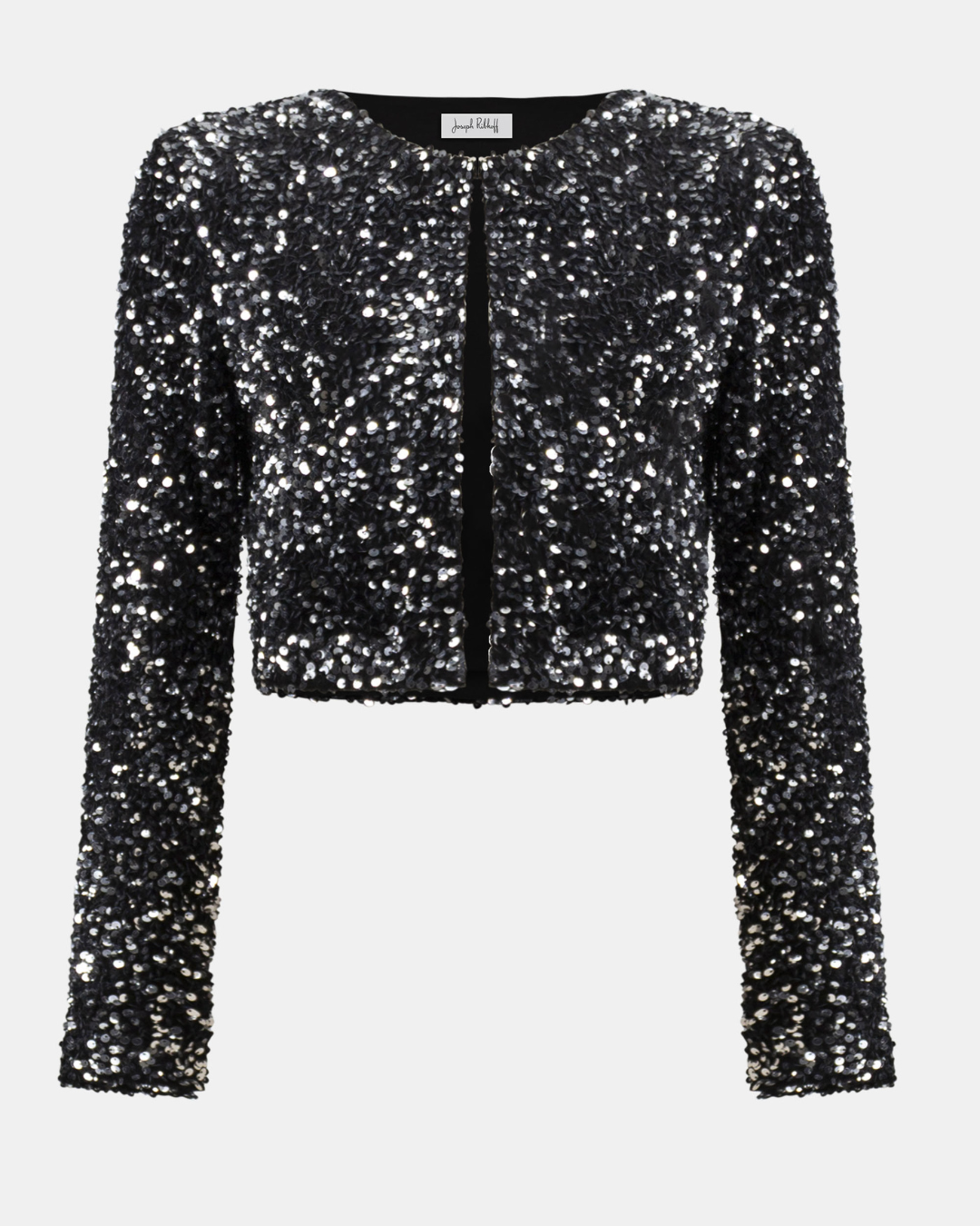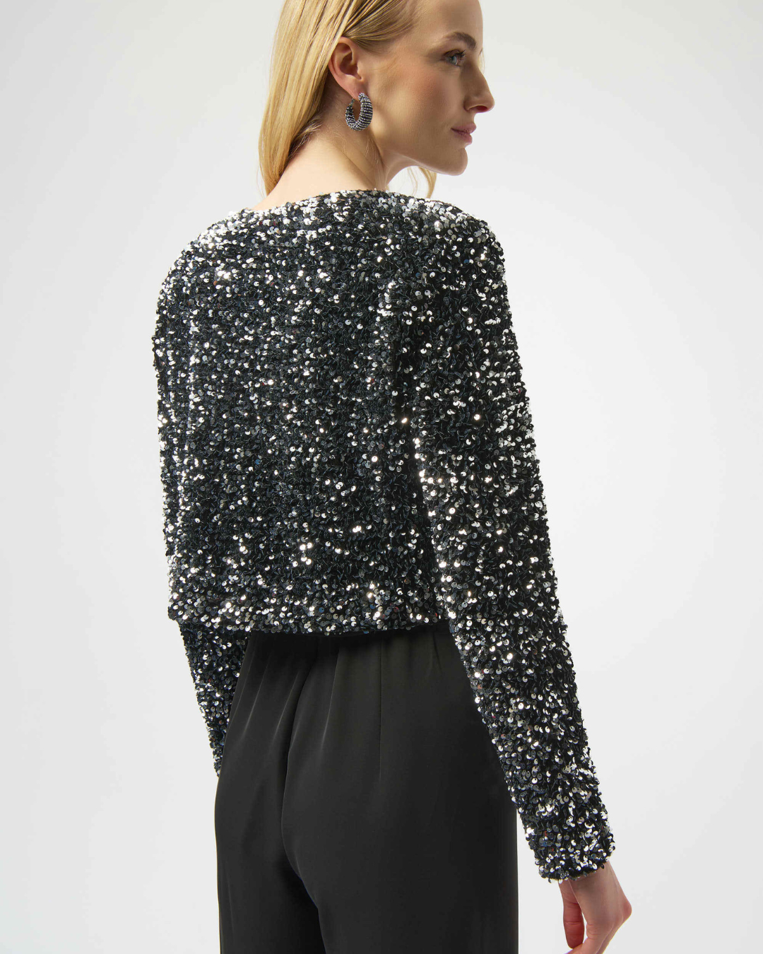 Denne cropped cover-up fra Joseph Ribkoff er et glitrende statement-plagg som kombinerer luksuriøs fløyel med sølvpaljetter for et glamorøst uttrykk. Den er designet med lange, rette ermer og en klassisk rund hals, og lukkes med en diskret hook-and-eye foran.