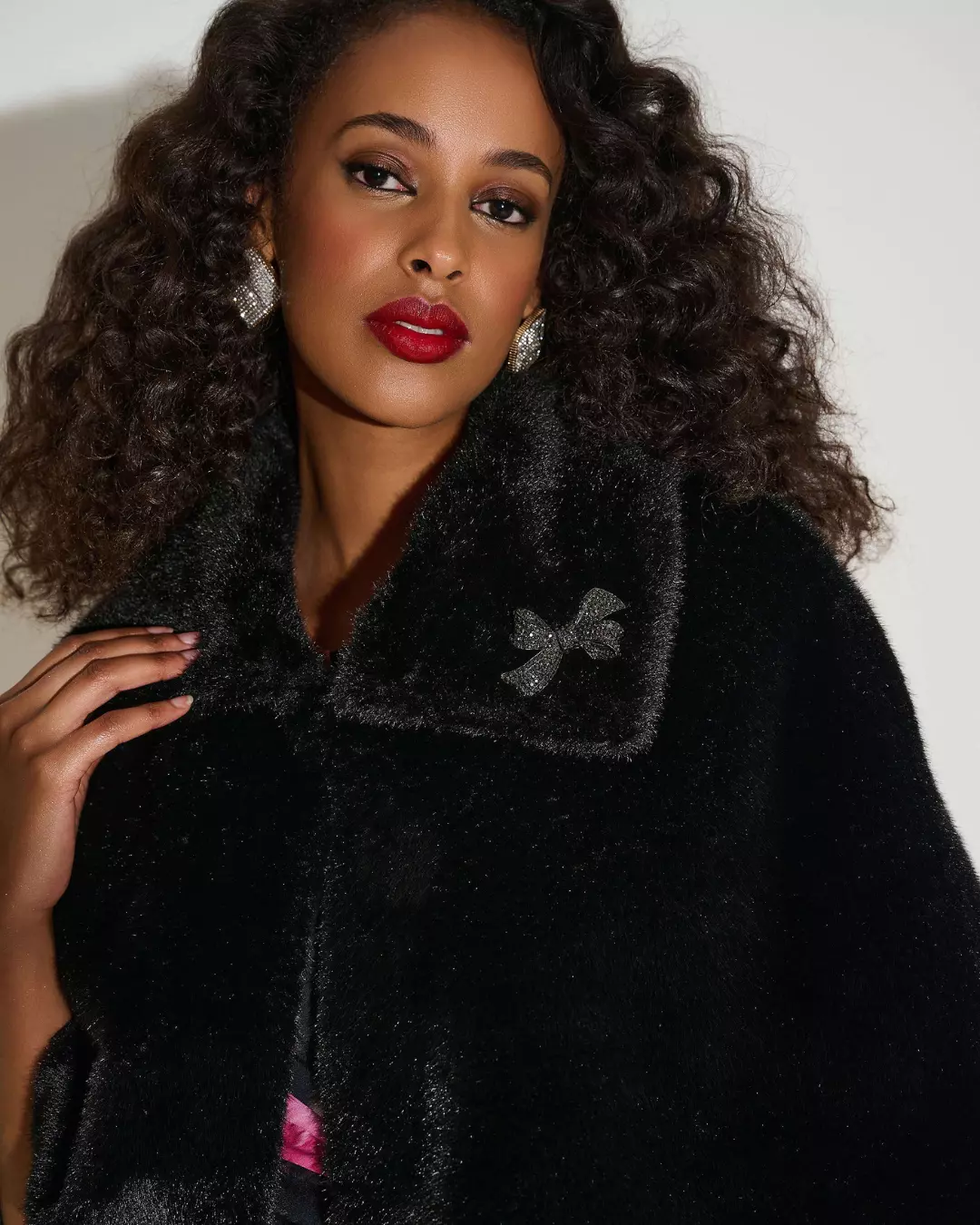 Denne eksklusive cape’en fra Joseph Ribkoff tilfører et luksuriøst preg til enhver kveldsantrekk. Den er laget i myk, imitert pels og har en elegant traktformet krage med en glitrende brosje som gir et sofistikert og festklart uttrykk. Den er ermeløs og lukkes med diskret hekte foran, mens det glatte satinfôret gir en behagelig og raffinert finish.