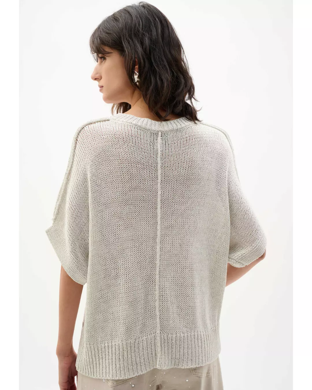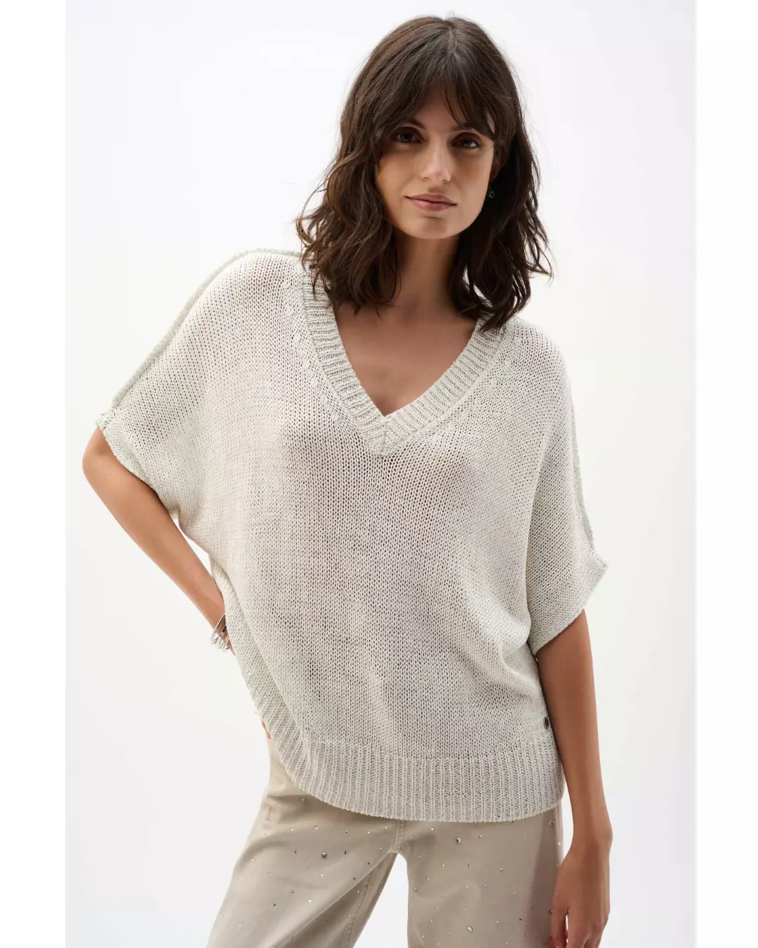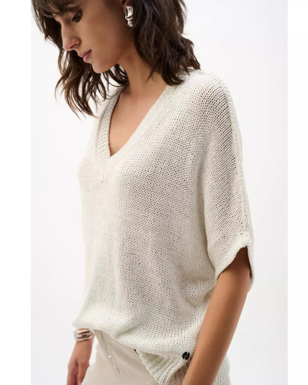 Fra Joseph Ribkoff kommer denne toppen i viskose og lurex, designet i en avslappet, rett silhuett som faller mykt. V-utringningen og de forlengede, korte dolman-ermene med ribbekant gir en uanstrengt finish som balanserer komfort med et polert, moderne uttrykk.