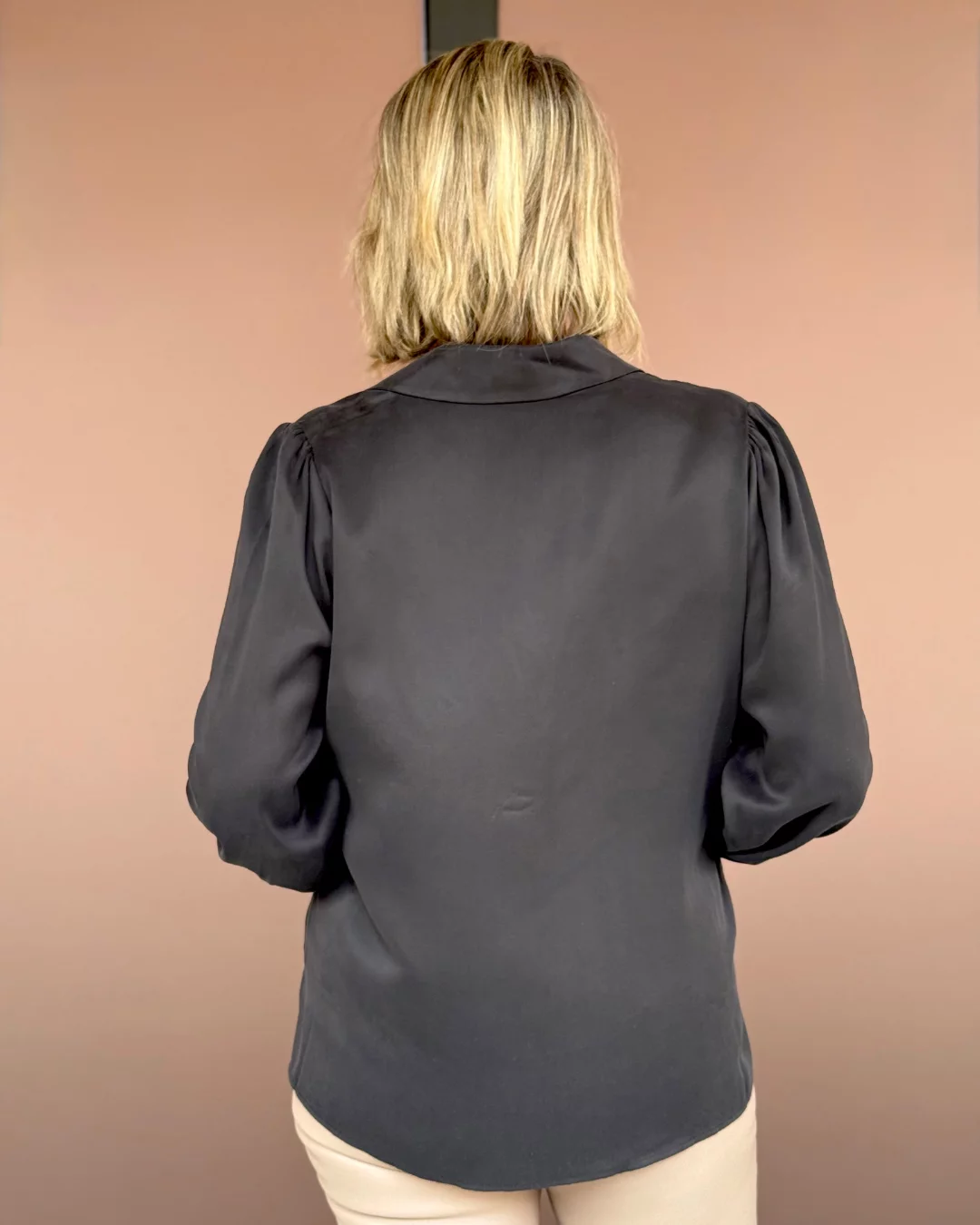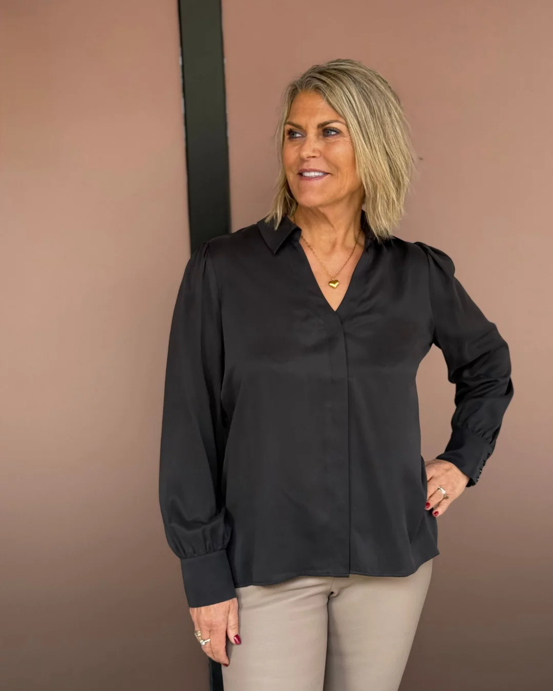 **Lisbeth Silkblouse – Black** fra Amuse er en elegant og allsidig silkebluse med klassisk krage, delikat v-utringning og lett puff på skuldrene. Den har en feminin og tidløs silhuett som gjør den velegnet både til hverdags og fest. Blusen er laget i 100 % ren sandvasket silke, som gir en matt og eksklusiv finish med myk følelse mot huden. Passformen er lett innsvinget, og lengden rekker til hoftene.
