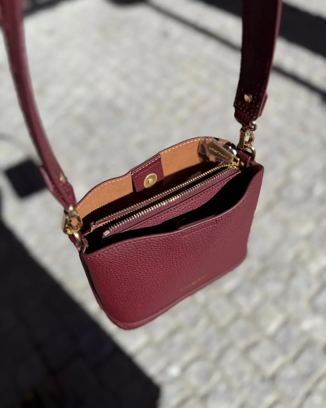 Den har to reimer – én kort og bred skulderreim i skinn for komfortabel bæring, og én lang, justerbar reim som kan brukes crossbody for en mer avslappet og praktisk stil.