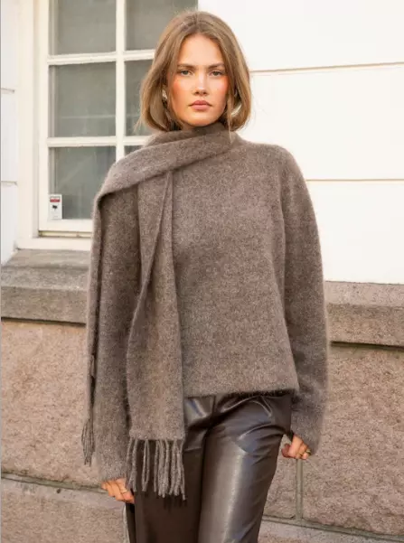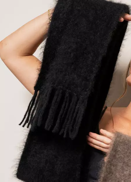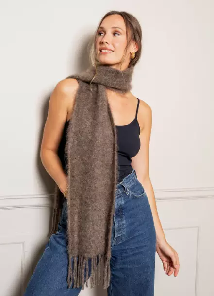 Mohair Scarf fra Miss Maya er laget av en myk mohairblanding. Det har frynsete kanter og er langt, slik at det kan bæres på mange måter. Dette skjerfet vil holde deg varm gjennom hele vinteren.