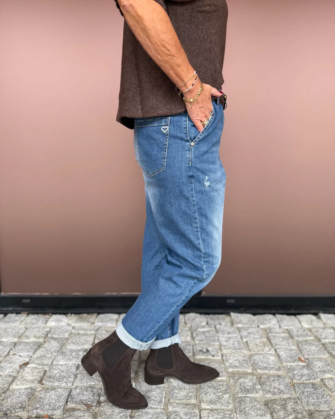 New Carrot – Blue Denim fra Please er en casual jeans med den karakteristiske carrot-fasongen: romslig rundt hoftene og smalere ned mot ankelen. Den har stikklommer i sidene, baklommer og beltehemper, samt en myk og tynn denimkvalitet med god stretch som gir komfort hele dagen. Modellen er ment å sitte litt løst, men kan også brukes mer tettsittende ved å gå ned én størrelse. Et hjerteemblem på baklommen gir en subtil signaturdetalj.