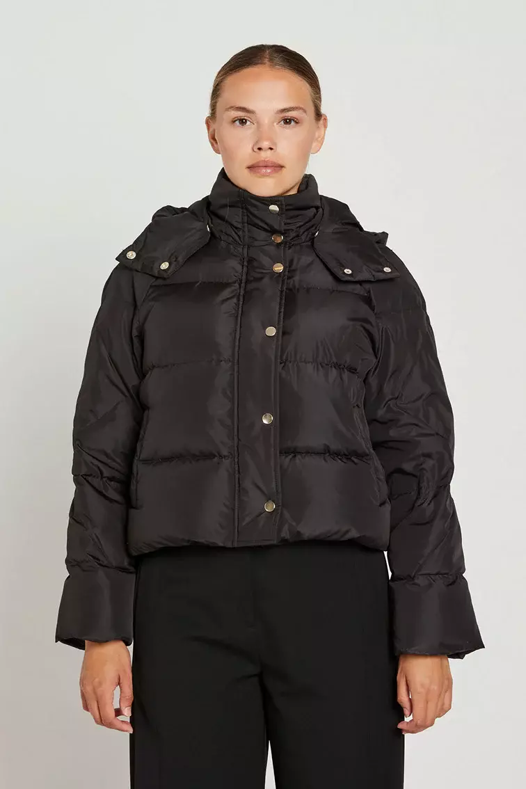 «Hirona Down Jacket» fra PBO er en dunjakke med avtagbar hette som lukkes med en gyllen glidelås og trykknapper. Denne jakken kombinerer funksjonalitet og stil, noe som gjør den ideell for høstens skiftende vær.