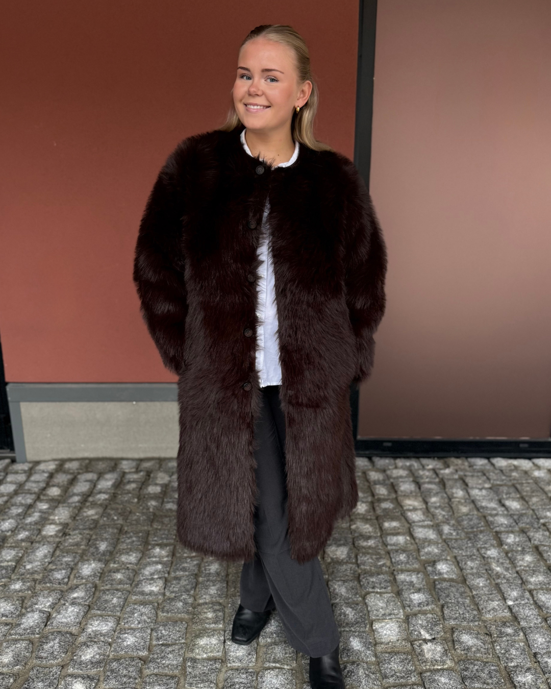 Suedette Bonded Chocolate fra Urban Code er en vendbar kåpe med et moderne og luksuriøst uttrykk. Den ene siden har en myk, pelslignende finish, mens den andre fremstår med kontrastfarget «skinn» for et mer strukturert og edgy look.