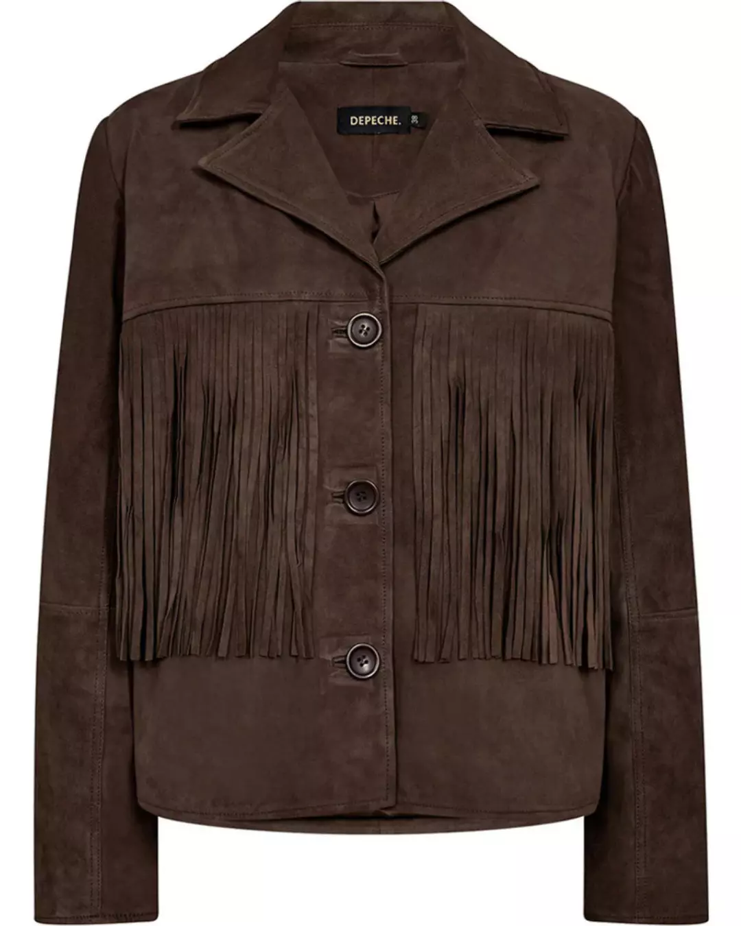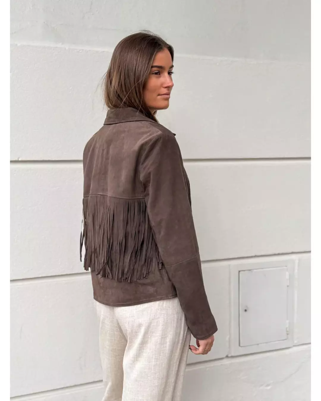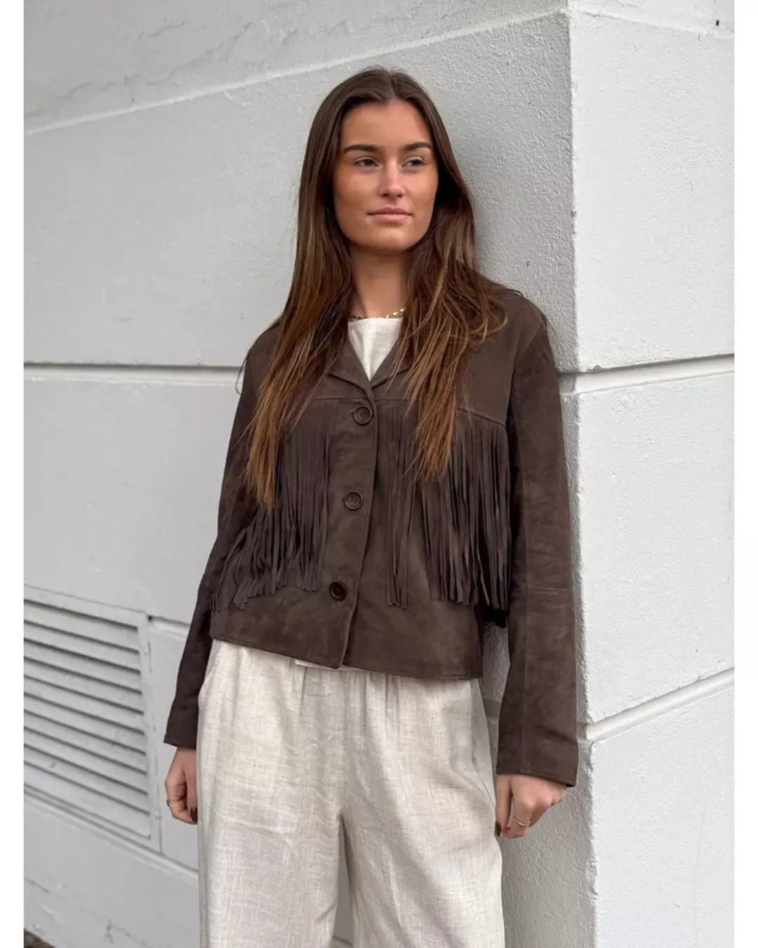 Vandana-jakken er en vakker og eksklusiv semsket jakke som kombinerer boho-vibber med et moderne, røft uttrykk. Den har klassisk slagkrage som fremhever den tidløse silhuetten, og frynser både foran og bak som gir jakken bevegelse og personlighet. Dette gjør den til et ekte statement-plagg. Jakken lukkes med tre knapper i front og er helfôret for komfort og en flatterende passform.