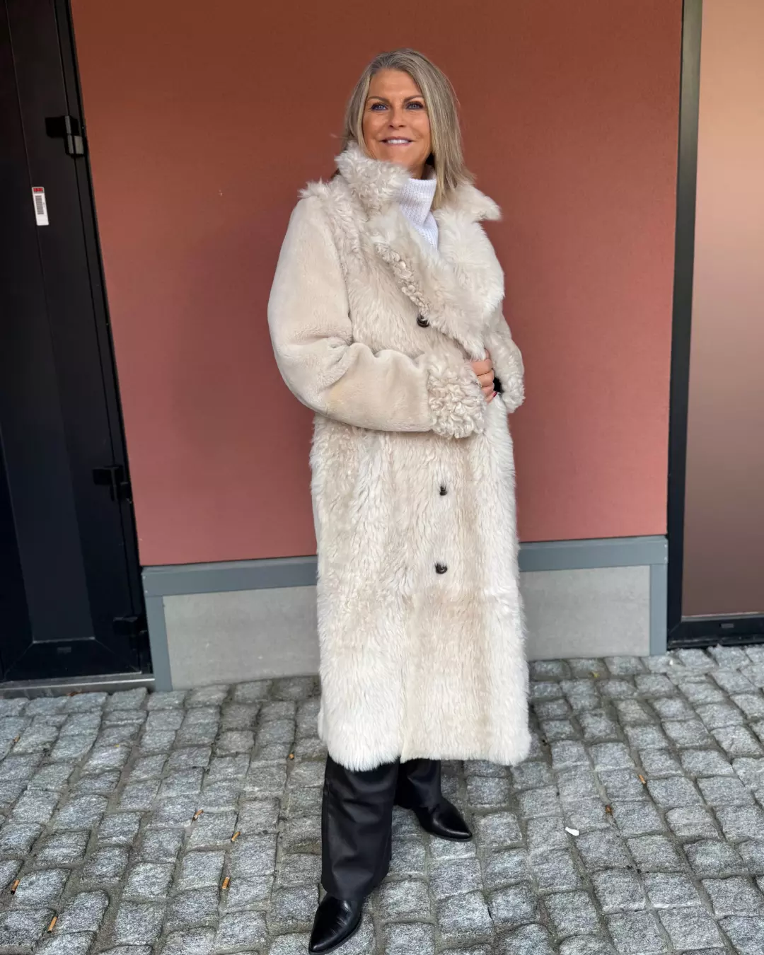 Vendbar lammeskinnskåpe fra Møller Pels er et tidløst og funksjonelt plagg laget av Mouton og Tigrado lam. Den 110 cm lange fasongen gir en elegant og balansert silhuett, samtidig som den gir god dekning og varme. Den vendbare konstruksjonen gjør kåpen allsidig og gir mulighet for to ulike uttrykk – én side med glatt, raffinert mouton-finish og én med myk, naturlig struktur fra Tigrado lam. Kåpen har en ren og klassisk linjeføring, med diskrete detaljer som fremhever kvaliteten i materialet og håndverket.