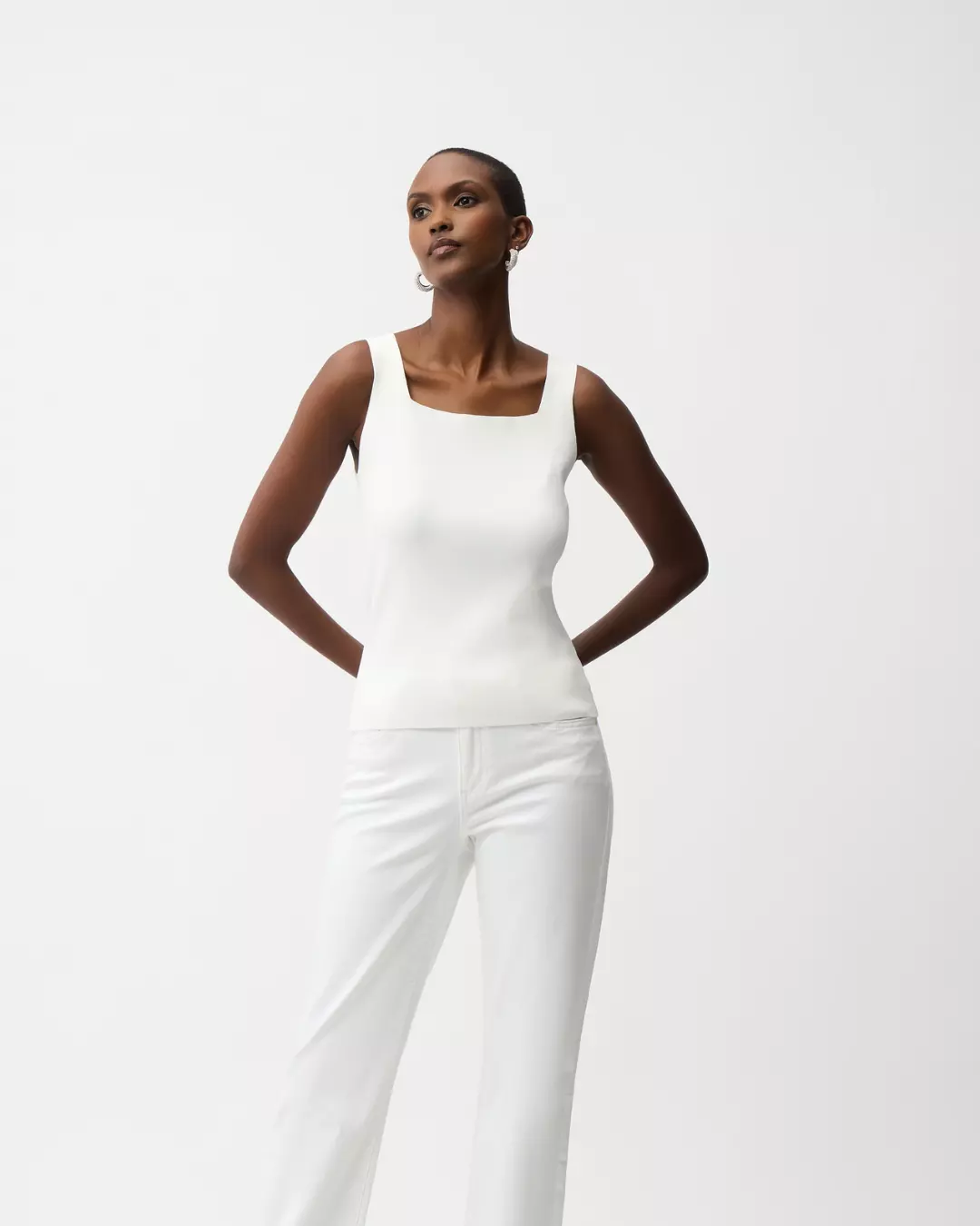 Viscose Blend Fitted Camisole fra Joseph Ribkoff er laget i tørr viskose og nylon med helstrikkede detaljer som gir et elegant uttrykk. Den har en stram passform og en stilren firkantet utringning som fremhever et sofistikert design. Plagget er ermeløst, uforet og måler ca. 53 cm fra skulder.